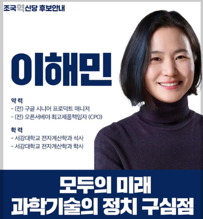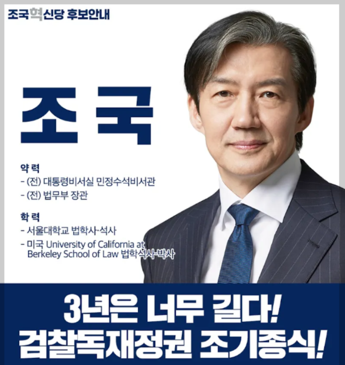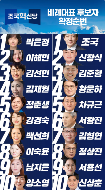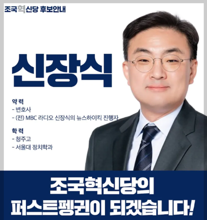 조국혁신당 영입 1호 신장식 법무법인 민본 파트너 변호사를 하였으며, 이해민 오픈서베이 CPO를 2호 인재 영입했습니다. 3월 5일 서왕진 전 환경청의 연구소장 및 김형연 문재인 정부 민정수석실 법무비서관을 초빙하였습니다.